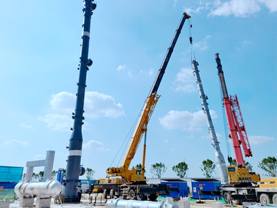 據(jù)悉,此次吊裝吸收塔和再生塔是本項(xiàng)目脫酸單元的核心設(shè)備,為確保本次吊裝的平穩(wěn)有序推進(jìn),項(xiàng)目組積極與咸陽(yáng)禮泉縣道路運(yùn)輸管理部門、供貨商、施工方等各方對(duì)接,確定了發(fā)貨時(shí)間、運(yùn)輸路徑,并嚴(yán)格篩查相關(guān)人員行程軌跡,確保吸收塔和再生塔的順利進(jìn)場(chǎng)。隨后及時(shí)進(jìn)行設(shè)備驗(yàn)收,同時(shí)督促施工方制定并優(yōu)化吊裝方案,確保吊裝機(jī)具到位,將吸收塔和再生塔成功吊裝到位。