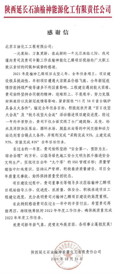 元旦前夕,北京石油化工工程有限公司先后收到延長石油集團和旗下的榆神能化公司發(fā)來的感謝信,信中對北油工程EPC總承包的50萬噸/年煤基乙醇項目建設期間付出的辛勤勞動表示感謝,并向項目現場廣大職工致以節(jié)日的問候。