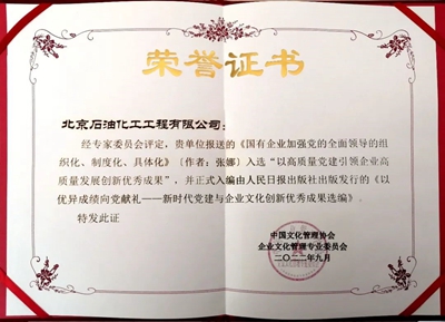 北京石油化工工程有限公司榮獲“黨建強企優(yōu)秀案例一等獎”。另外,公司黨委申報的2021年度和2022年度兩篇黨建和企業(yè)文化研究成果獲獎:《黨建引領文化促進企業(yè)高質量發(fā)展的管理體系研究》榮獲“企業(yè)黨建實踐創(chuàng)新成果一等獎”;《國有企業(yè)加強黨的全面領導的組織化、制度化、具體化》入選“以高質量黨建引領企業(yè)高質量發(fā)展創(chuàng)新優(yōu)秀成果”,并正式入編由人民日報出版社出版發(fā)行的《以優(yōu)異成績向黨獻禮——新時代黨建與企業(yè)文化創(chuàng)新優(yōu)秀成果選編》。