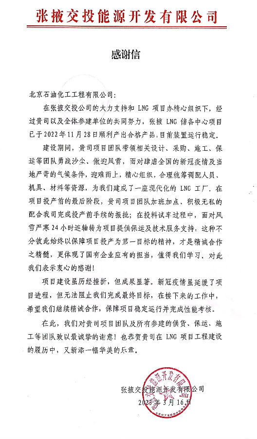 近日,北京石油化工工程有限公司(簡稱:北油工程)收到張掖交投能源開發(fā)有限公司發(fā)來的感謝信,對張掖LNG儲備中心項目建設(shè)成果表示了肯定,對我公司項目團隊表現(xiàn)出的技術(shù)專業(yè)性及不畏艱難、勇于擔當?shù)膱F隊精神表示了感謝。