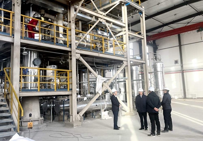 調(diào)研座談會前,許緘濤、田偉一行來到生產(chǎn)區(qū)和中央控制室進行了參觀交流,深入了解了公司生產(chǎn)運行、產(chǎn)品特性、主要裝置性能等情況。