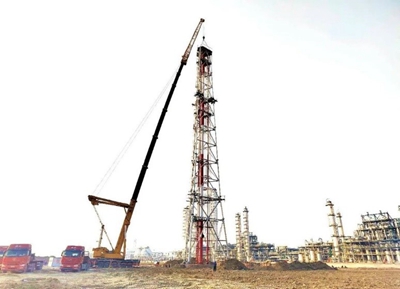 據(jù)悉,該火炬高80米,總重100噸,分三段在地面組裝后依次進(jìn)行吊裝。為確保吊裝工作的順利進(jìn)行,項(xiàng)目部組織業(yè)主、監(jiān)理、承包商對(duì)火炬組裝的質(zhì)量及組裝臨時(shí)平臺(tái)的搭設(shè)情況進(jìn)行全方位檢查,吊裝過(guò)程中,項(xiàng)目人員嚴(yán)格按照操作規(guī)程執(zhí)行,確保吊裝作業(yè)的安全、平穩(wěn)。目前,施工人員正加緊配套地面火炬管廊、附屬設(shè)備等相關(guān)工作,加班加點(diǎn)確;鹁姘雌谕队。