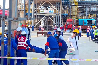 演練模擬一名工人在5米高作業(yè)平臺進行設(shè)備檢修時,因安全帶掛鉤意外脫落墜落至下方安全網(wǎng),造成左小腿骨折的緊急情況。事故發(fā)生后,現(xiàn)場安全員立即啟動應(yīng)急響應(yīng)程序。應(yīng)急指揮部在90秒內(nèi)完成預(yù)案啟動,警戒組迅速封鎖現(xiàn)場并疏散周邊作業(yè)人員,救援組攜帶專業(yè)設(shè)備抵達現(xiàn)場,醫(yī)療組同步完成急救物資準備。所有行動均在設(shè)備密集的凈化裝置區(qū)完成,各小組協(xié)同配合在最短時間內(nèi)完成了救援任務(wù)。